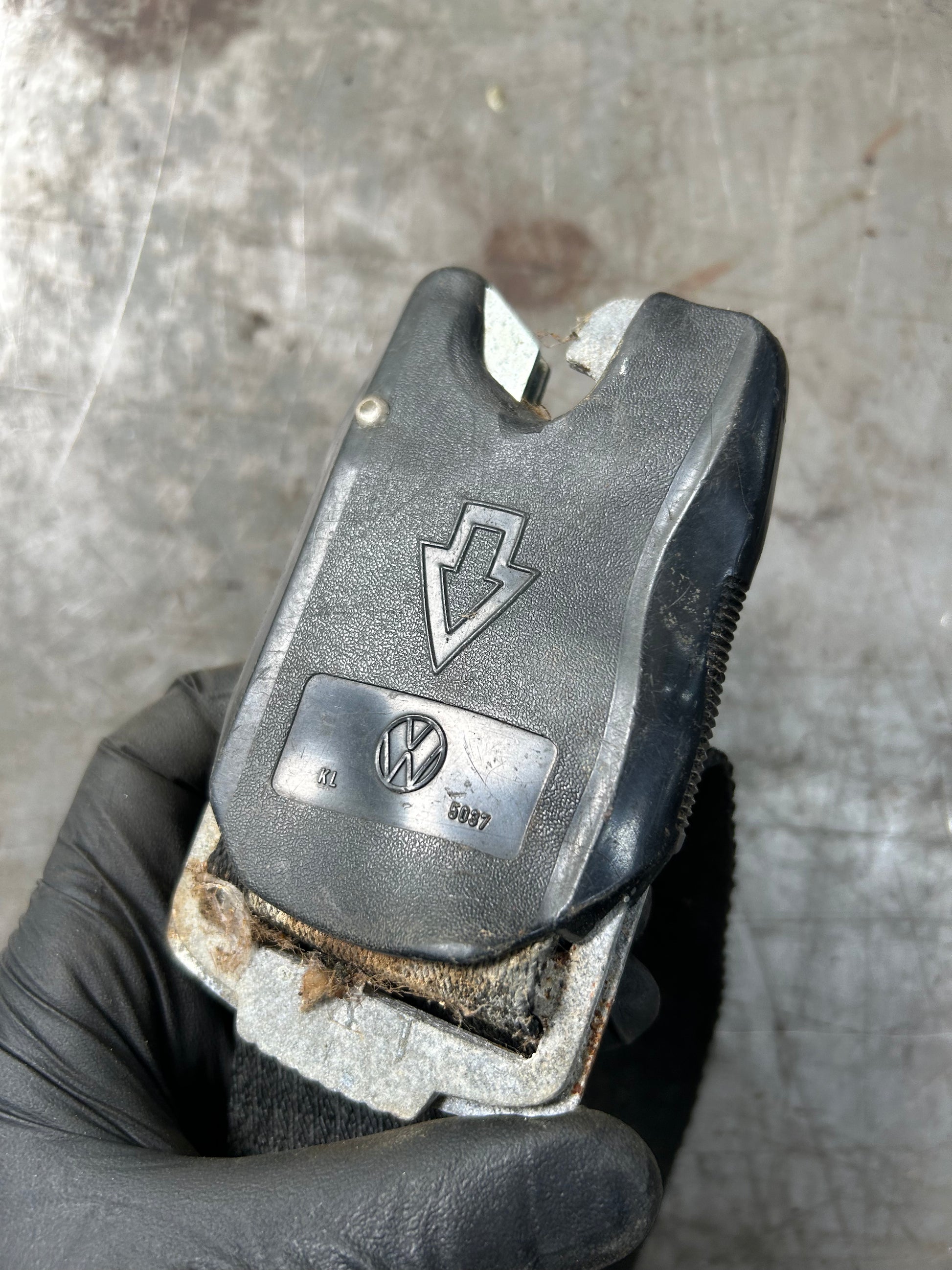 ~1968-69 Beetle "lobster claw" front seat belt. Belt is in decent shape but plastic end has been melted and latch is stuck. 111857775A.
