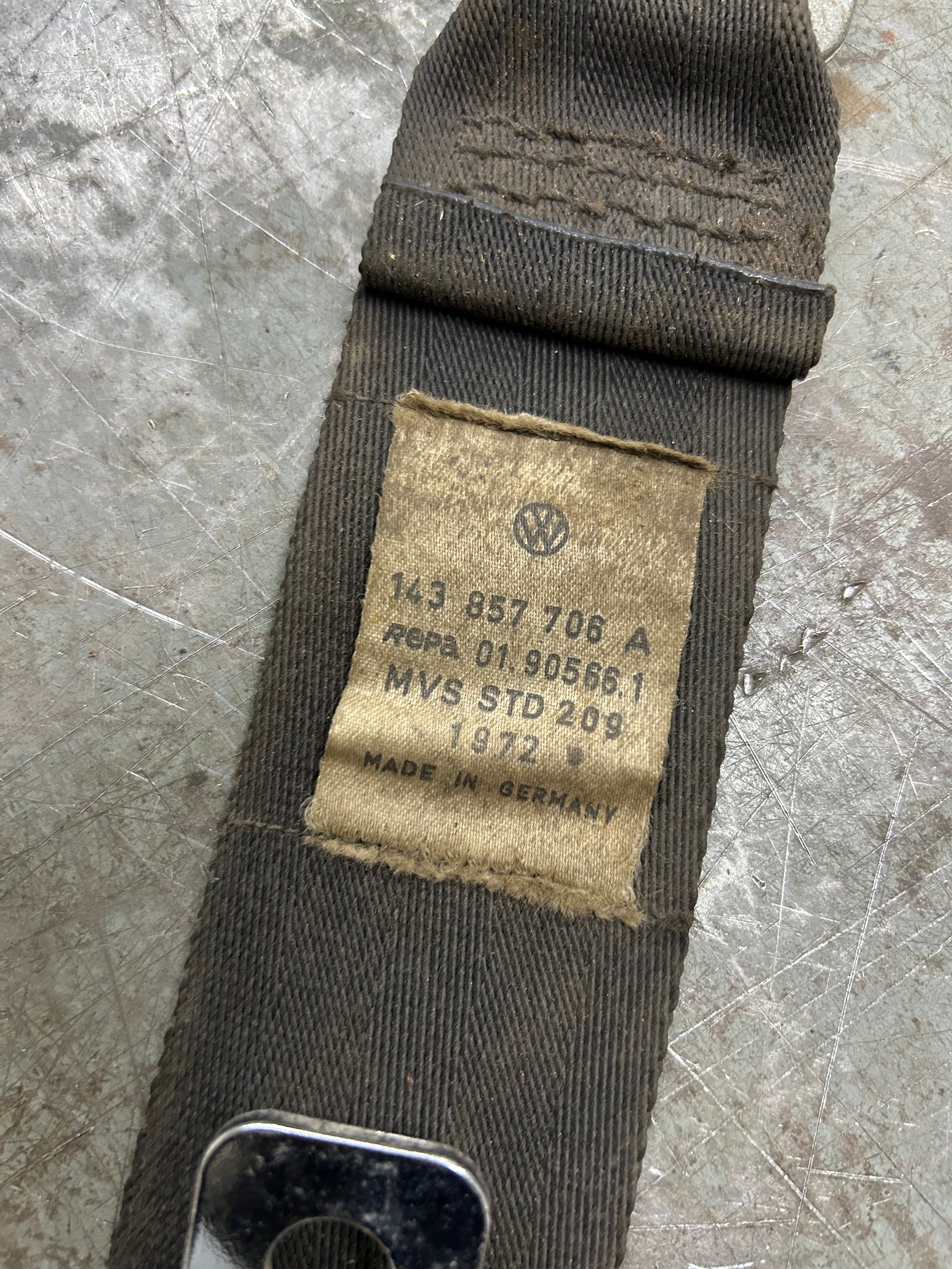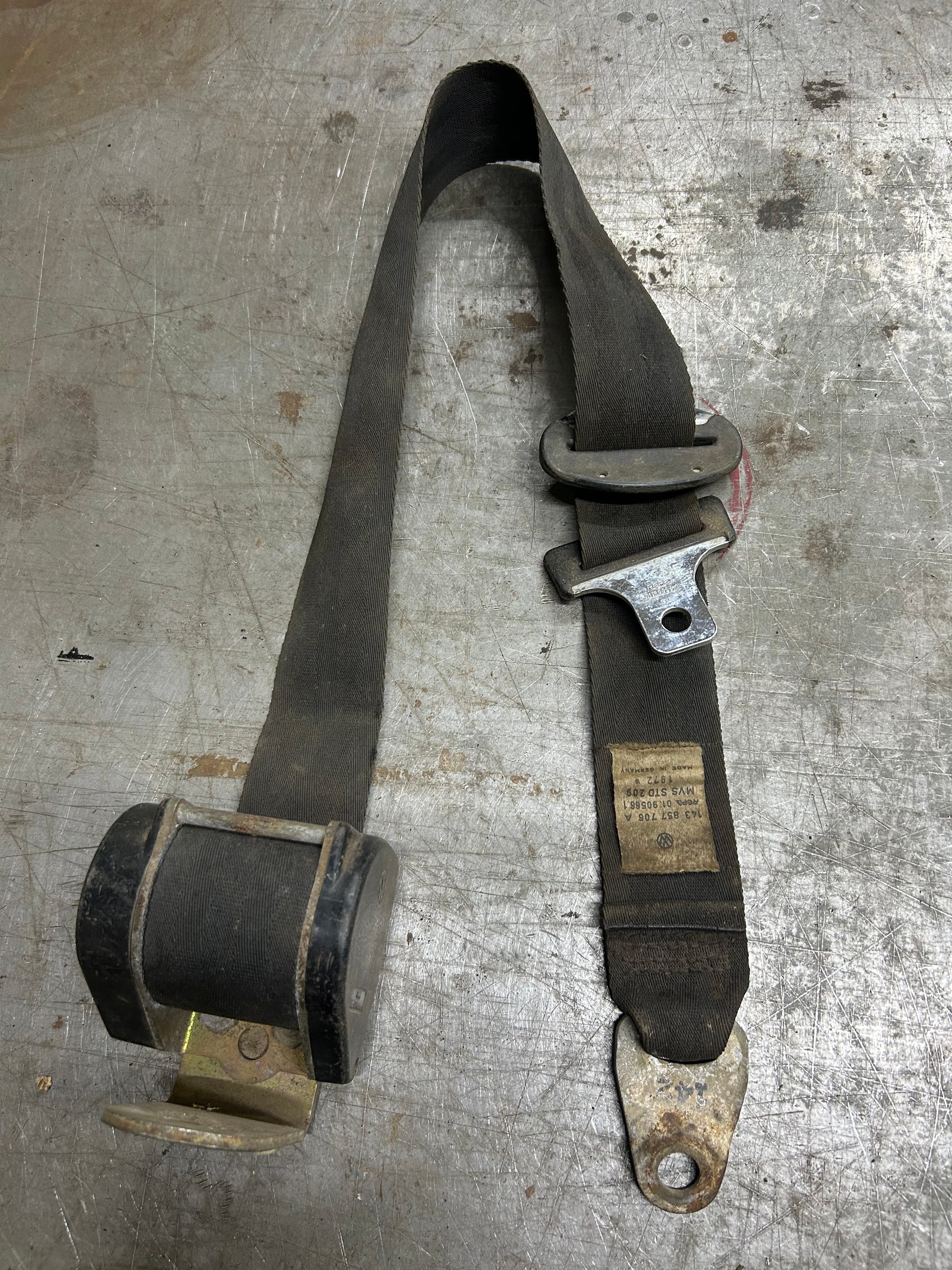 1970-74 Karmann Ghia coupe retractable 3 point seat belt. Belt is in decent shape, re-tractor will need to work to get working smoothly. Dated 1972. Will include mounting hardware. 143857706A.