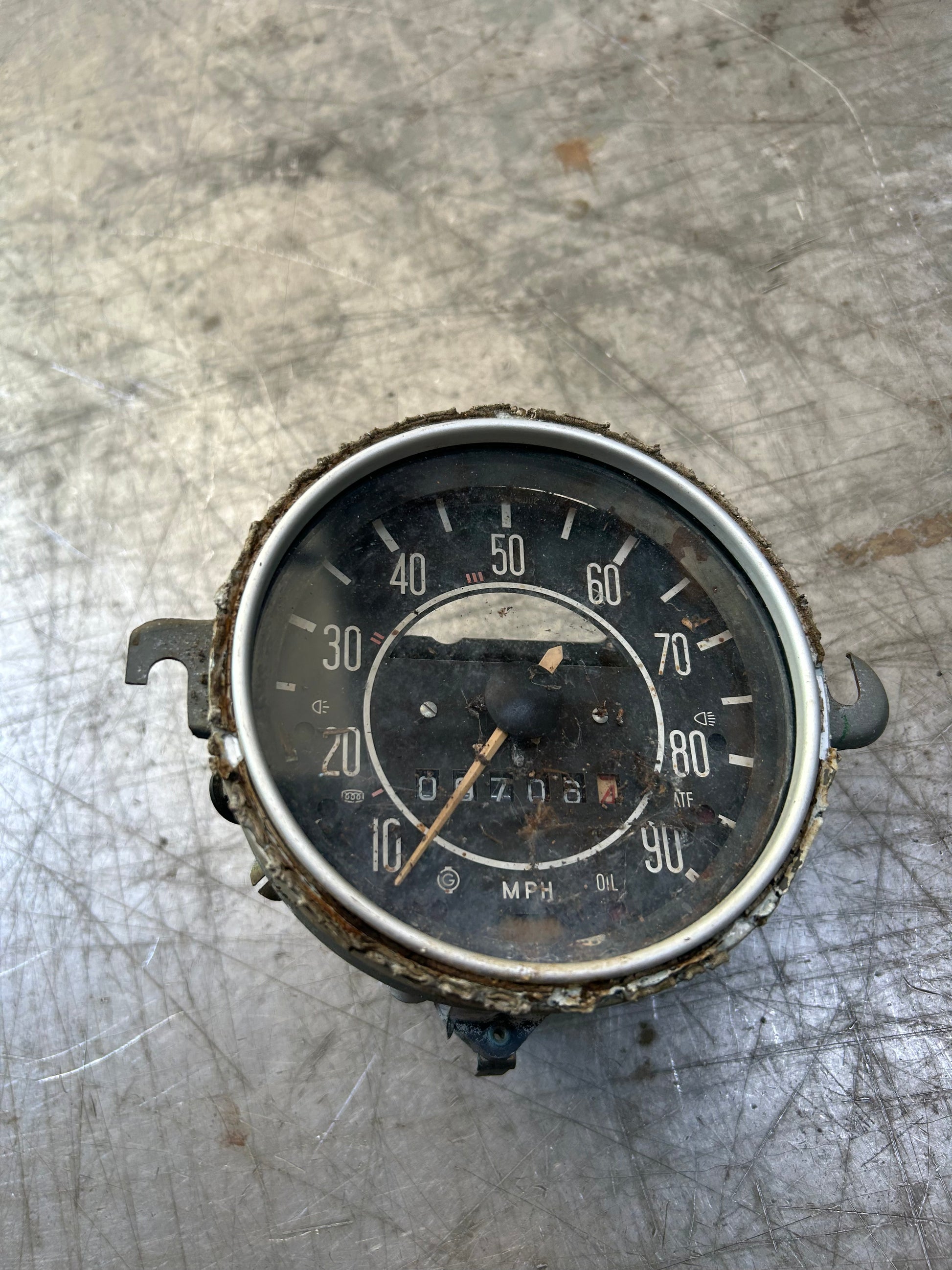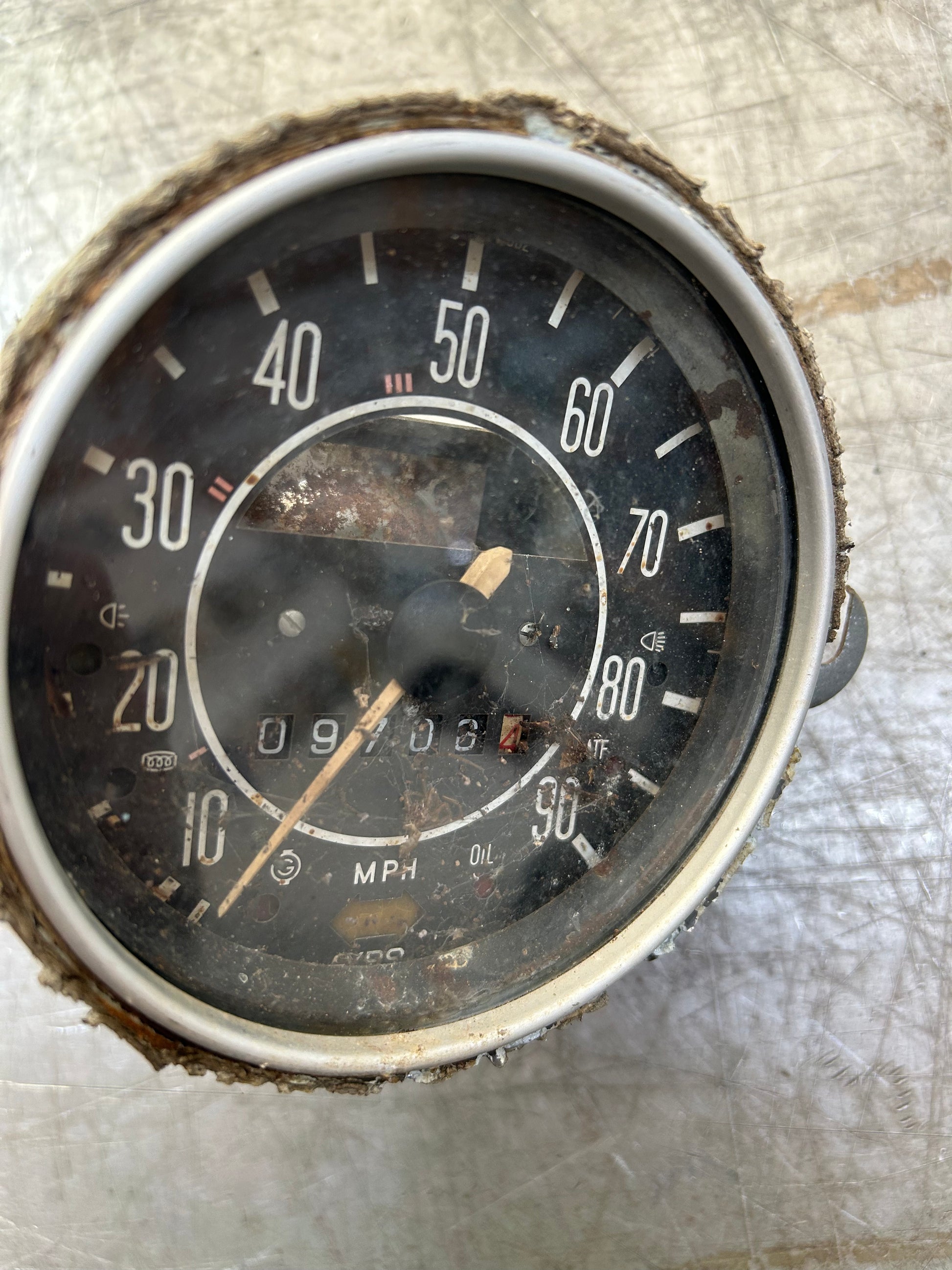 1970 Beetle speedometer. Dated 1/70. Does spin when briefly tested. Face does have some surface rust as well as the housing. Fuel gauge missing. Good parts unit or can be cleaned up and used.