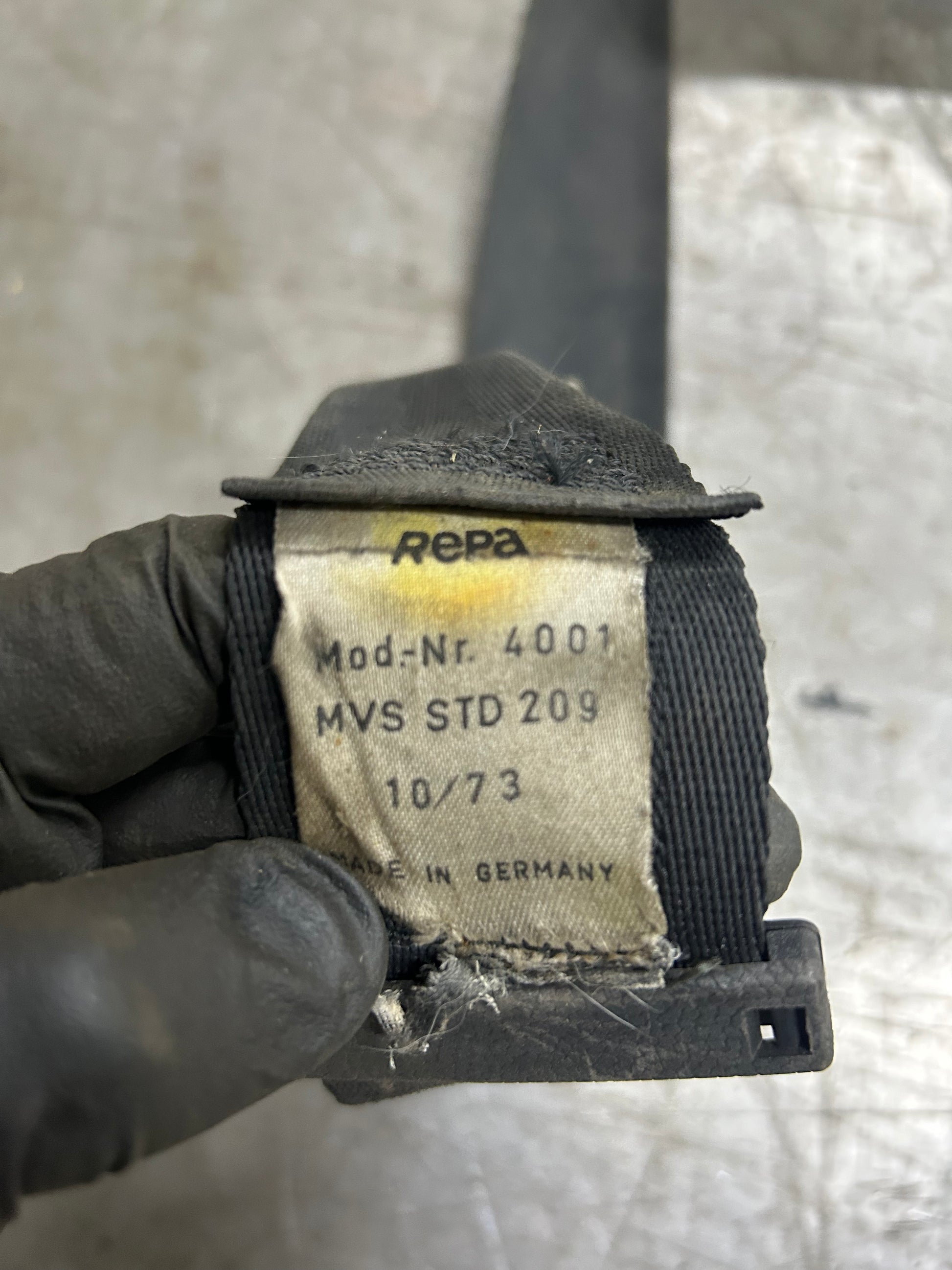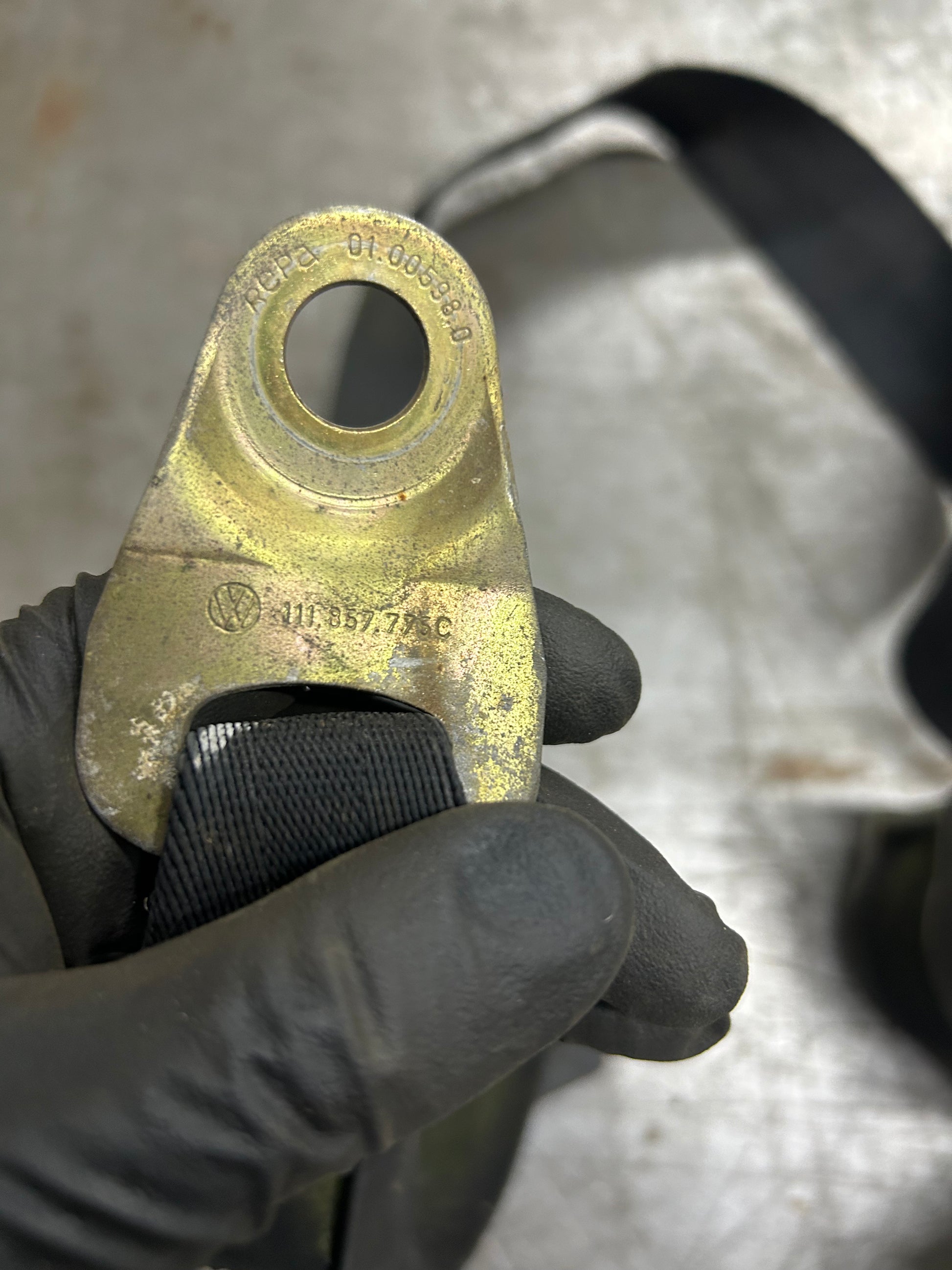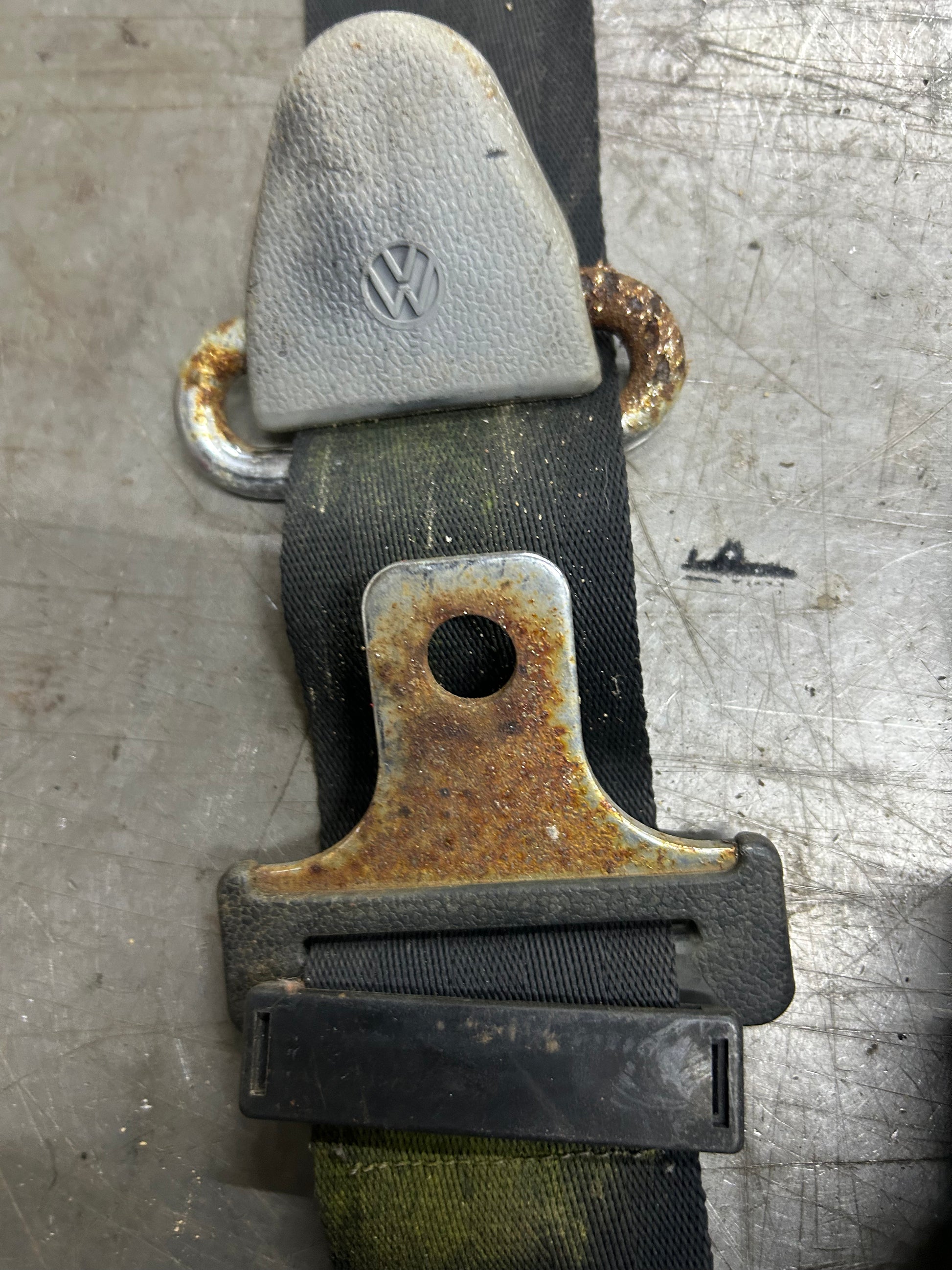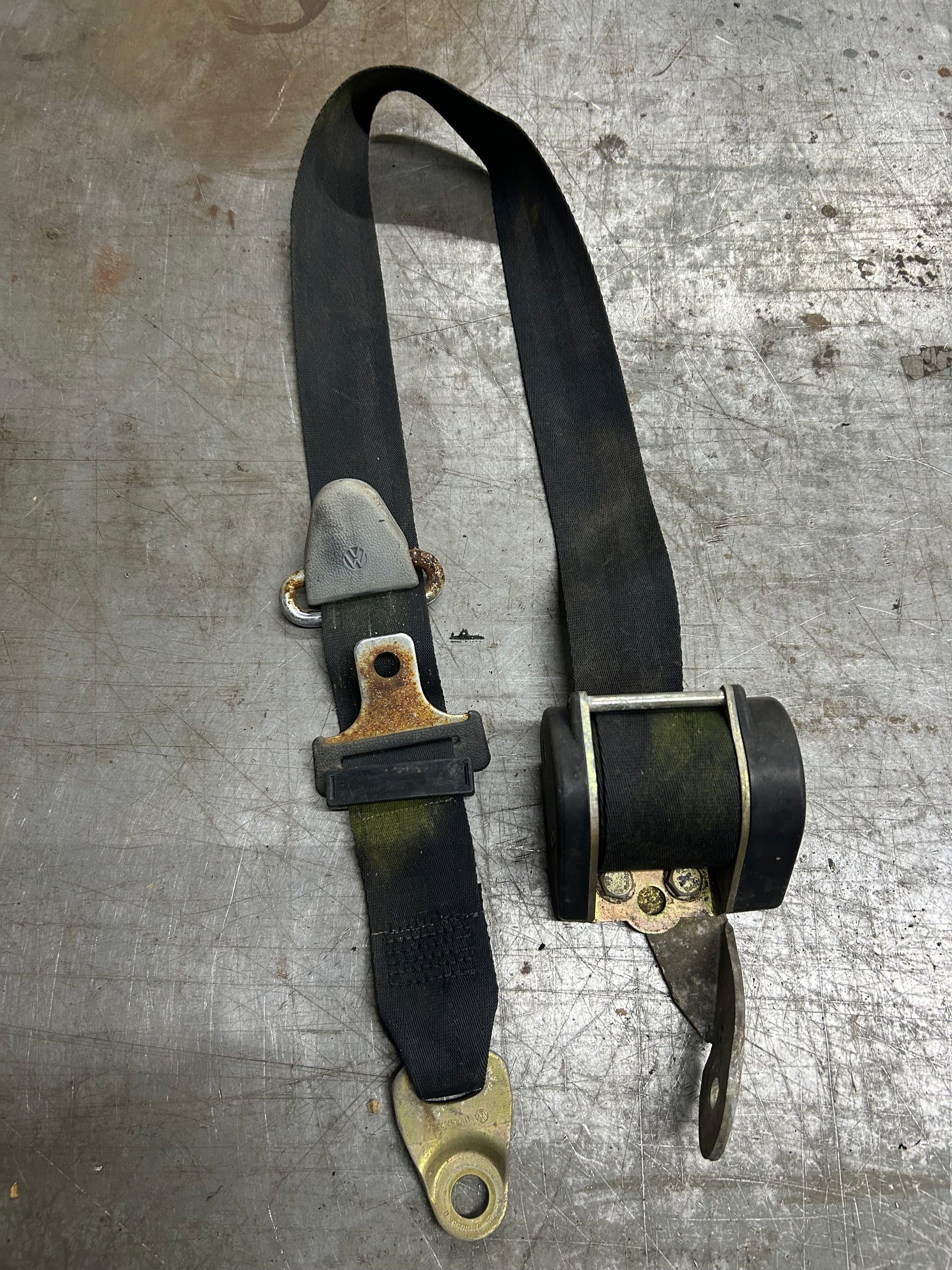 1973-77 Beetle/Super Sedan retractable driver left side seat belt. Belt is in decent shape and re-tractor works well, buckle has rust pitting. Will include mounting hardware. One bolt to attach the belt assembly to the lower bracket is stripped, centering pin on the bracket is also missing. 111857775C.