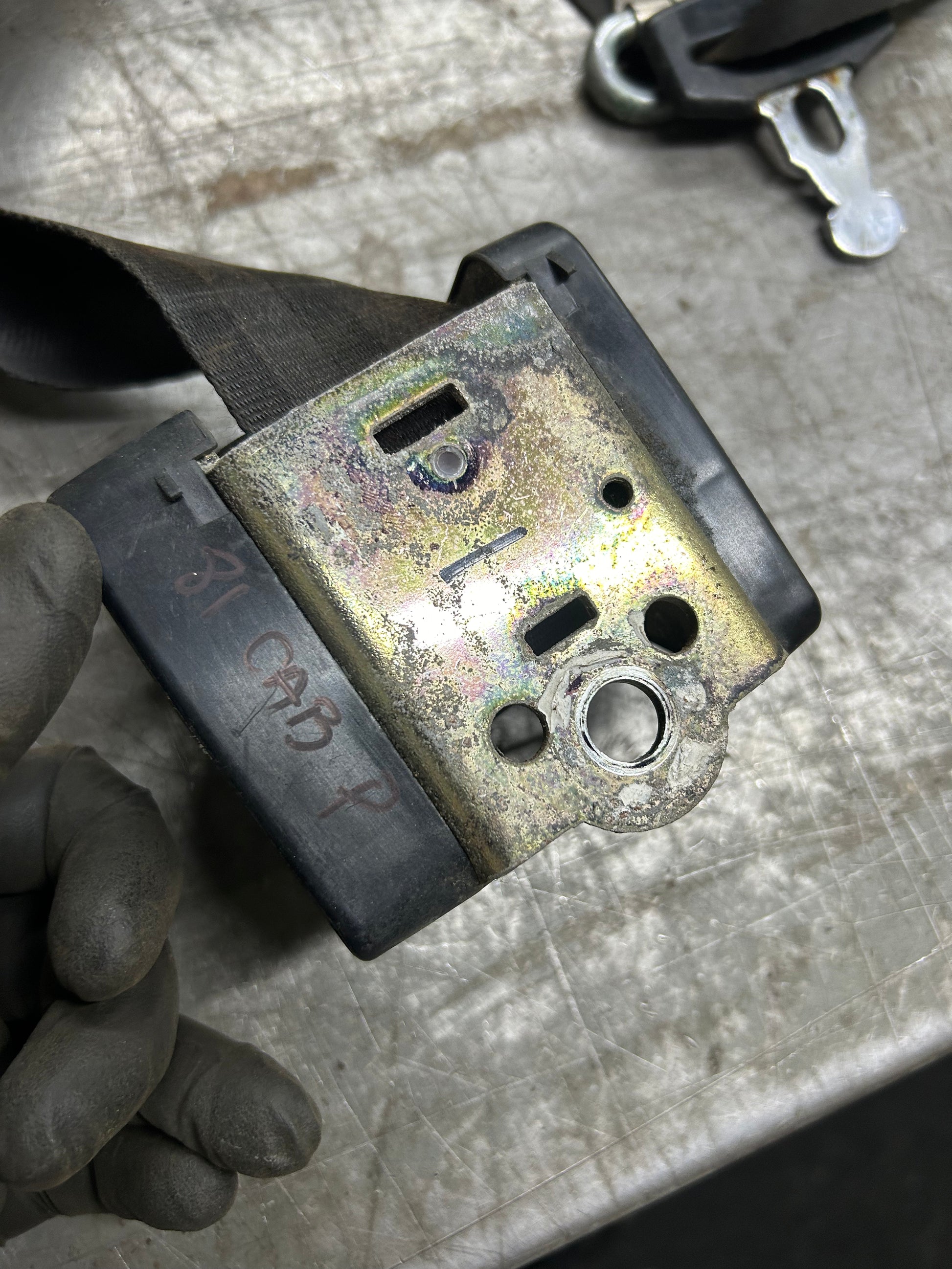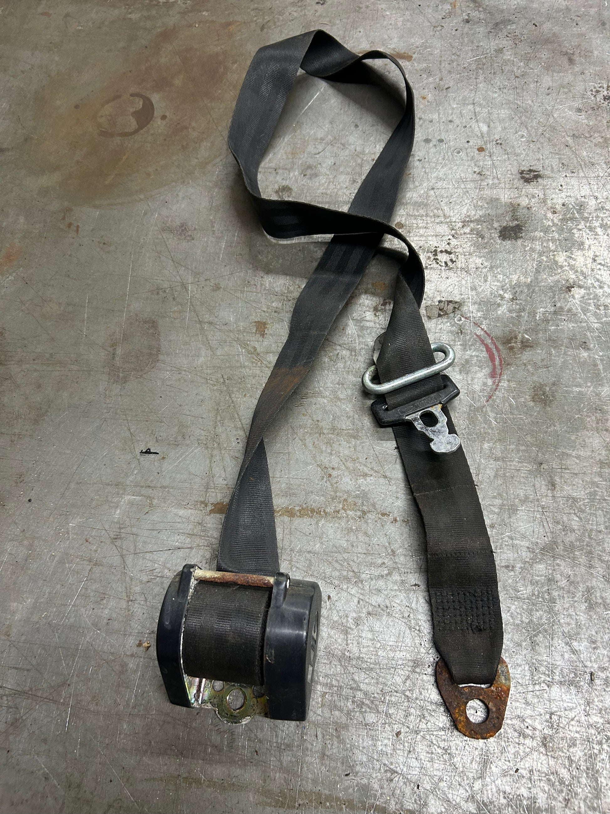 MK1 Rabbit Cabriolet/Cabby 3 point front seat belt. Belt is in decent shape and re-tractor works well, buckle/upper/lower pivot has rust pitting. Removed from the passenger side of an '81 model. Will include mounting hardware. 155857705.